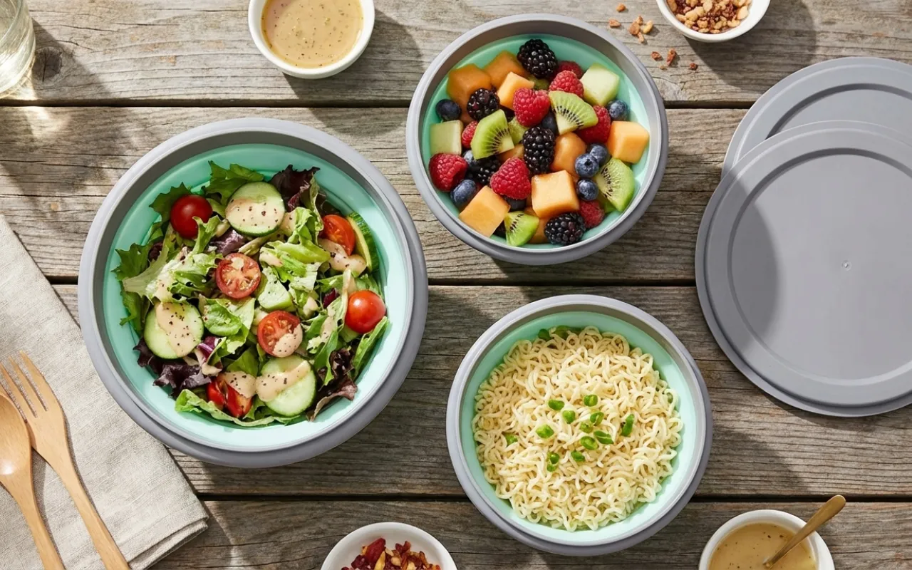 Los tazones aguantan tanto sopa caliente como ensalada fría sin deformarse. Las tapas se ajustan firmemente y me gusta que se aplanen para guardarlos fácilmente en la autocaravana.