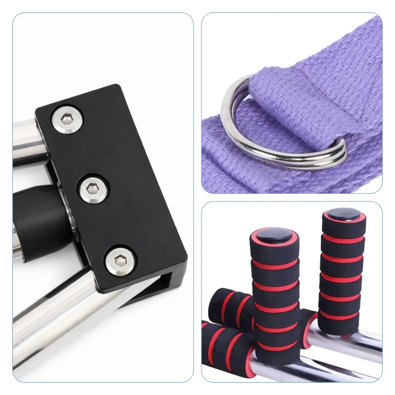 Las barras de acero inoxidable y los agarres acolchados ofrecen soporte duradero. La suave espuma amortigua los pies para una sesión de estiramiento sin dolor.
