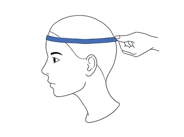 - 2. Envuelve la cinta métrica alrededor de tu cabeza, colocándola justo por encima de las cejas y las orejas, y alrededor de la parte más ancha de la parte posterior de tu cabeza.