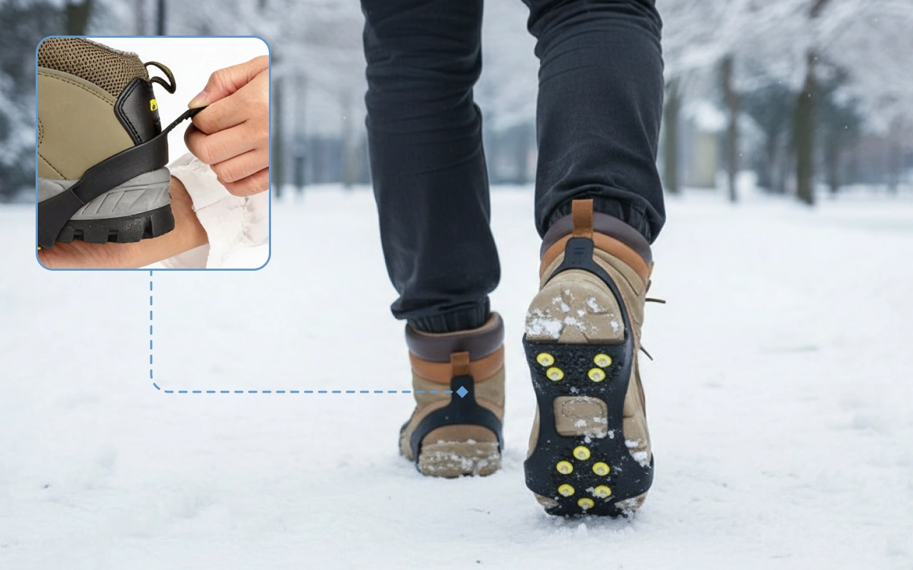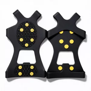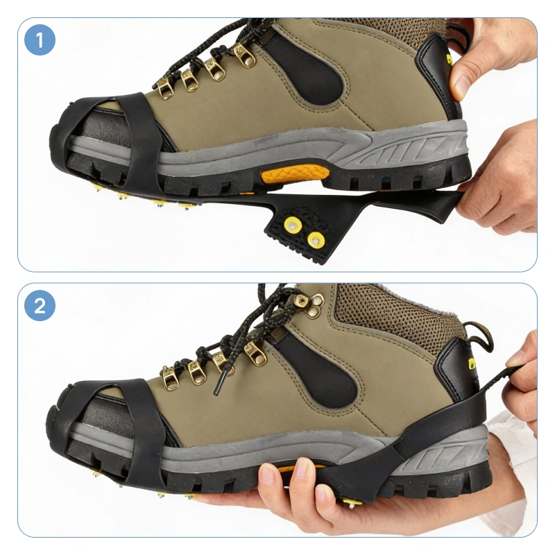 No necesitas herramientas ni correas, la instalación toma solo segundos. Quita los crampones igual de fácil para mantener tus zapatos limpios.