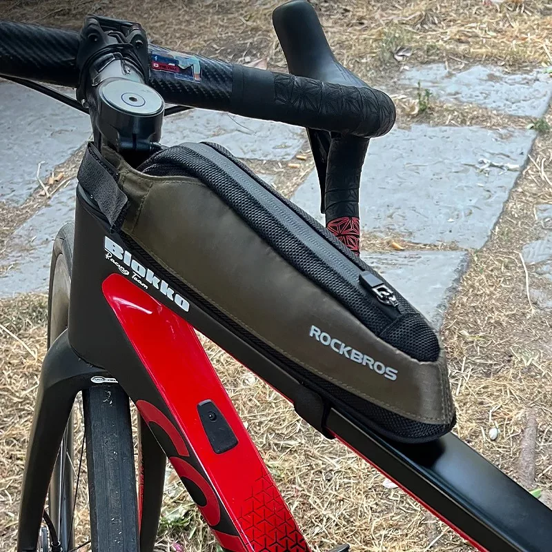 Pongo mi billetera y herramientas aquí cada vez que ando en bicicleta. Se ajusta bien al cuadro y no se mueve ni en senderos irregulares.
