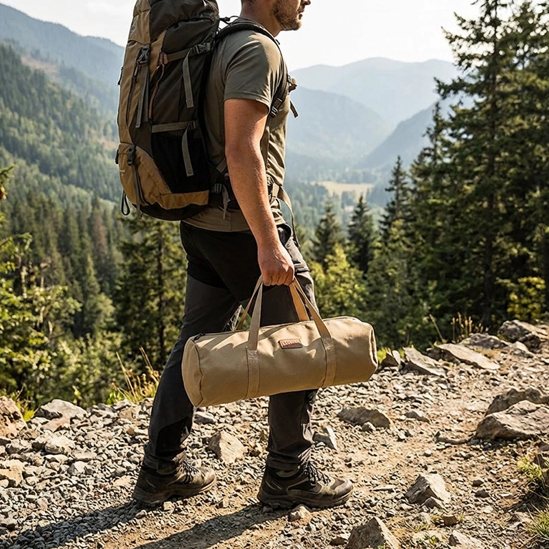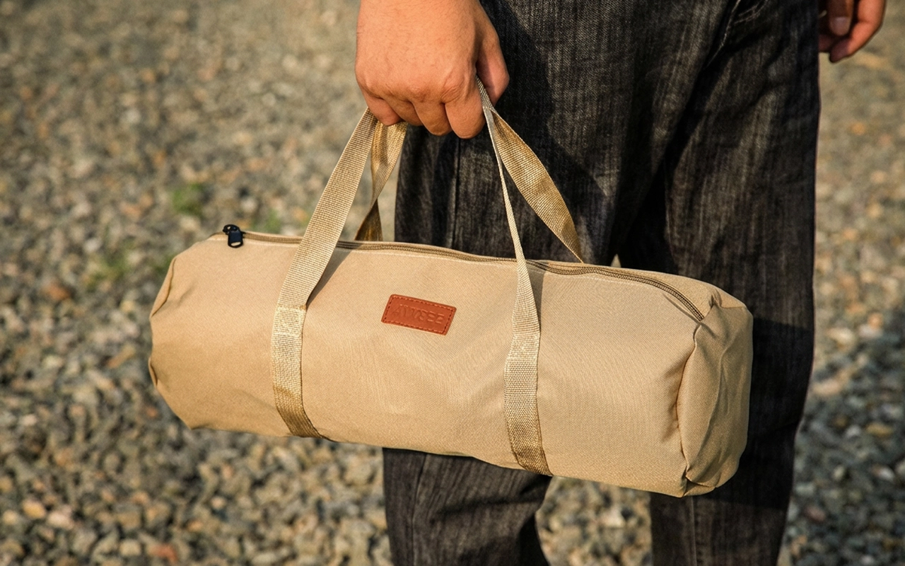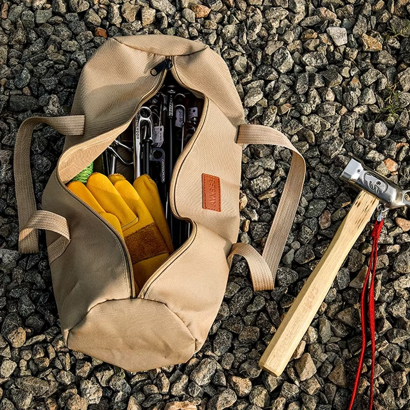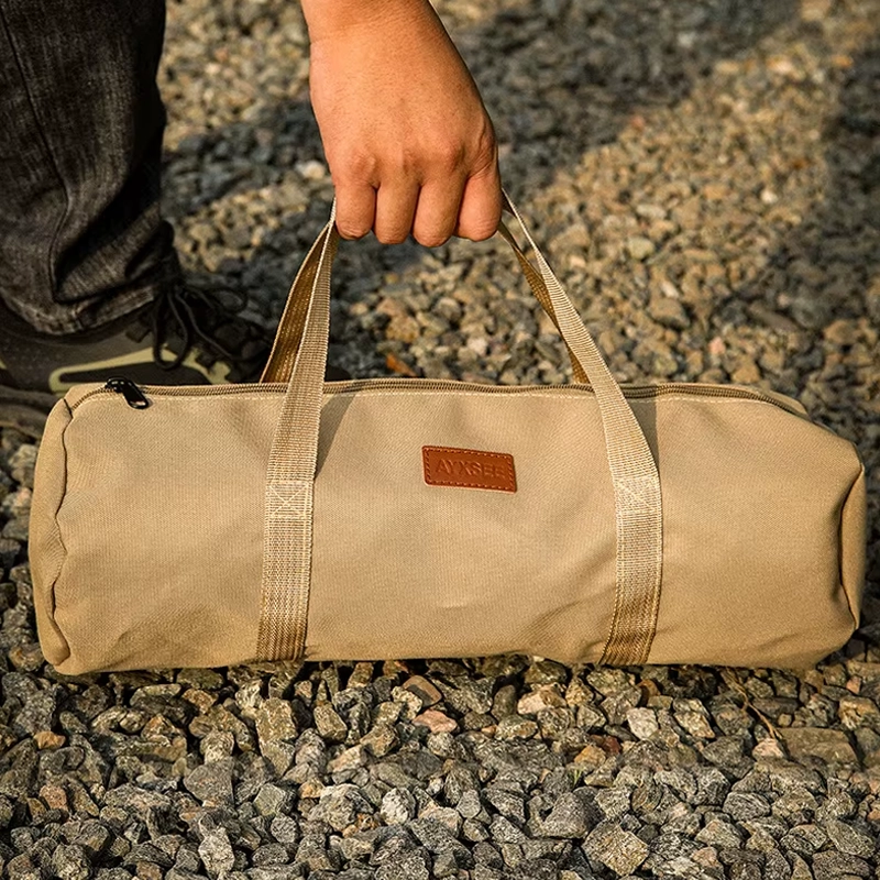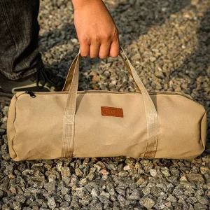 La guardo en nuestra furgoneta camper con piquetas de repuesto y un martillo plegable. La tela se siente resistente y las asas son cómodas incluso cuando está llena.