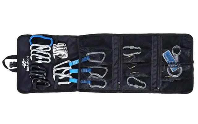 Almacenamiento espacioso y bien organizado para equipo de escalada.