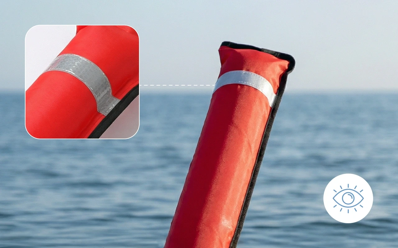 Marcas muy visibles, ¡fácil de localizar! Me sentí seguro saliendo lejos del barco. Ocupa muy poco espacio. Compraré otra para mi hermano.