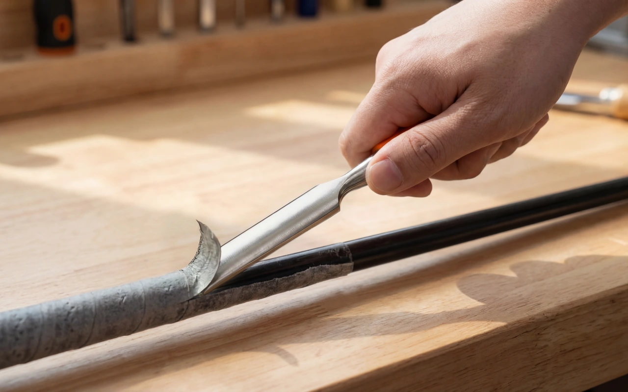 Antes temía tener que raspar la cinta con un cuchillo. Esta herramienta para grips es mucho más segura, se adapta bien a la varilla y me permite terminar todo un juego en una sola sesión.