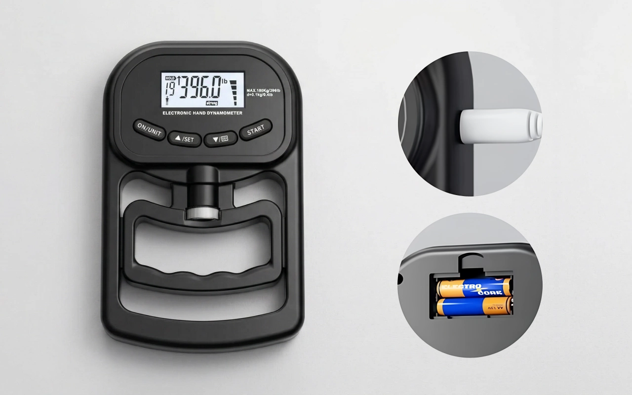 Elige entre carga por USB o pilas tradicionales según lo necesites. Sigue usando el dinamómetro de agarre Threo sin preocuparte por quedarte sin energía.