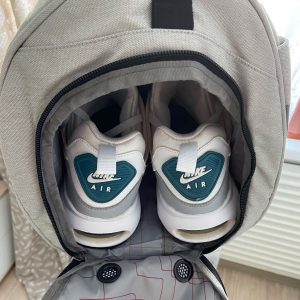 El compartimento mantiene perfectamente mis zapatos separados de todo lo demás. Aprecio el espacio extra para mis botellas de agua. Muy contento con esta bolsa.