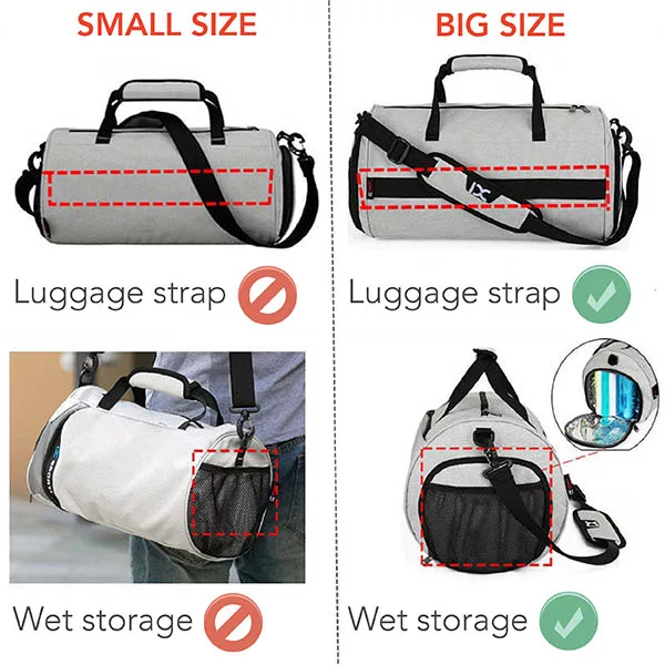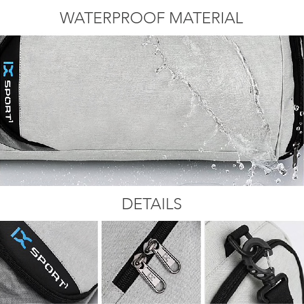 Esta bolsa de gimnasio está fabricada con materiales impermeables diseñados para absorber la humedad y el sudor mientras proporcionan la máxima comodidad. Además, protege contra lluvias y ayuda a eliminar factores externos como la resistencia al viento. Una correa de hombro desmontable facilita su transporte. Esta bolsa de gimnasio de alta calidad también cuenta con una correa Oxford en la parte trasera de las bolsas de tamaño grande para sujetarla a los tubos de las maletas. Es perfecta para viajes de larga distancia si buscas una opción cómoda para viajar.