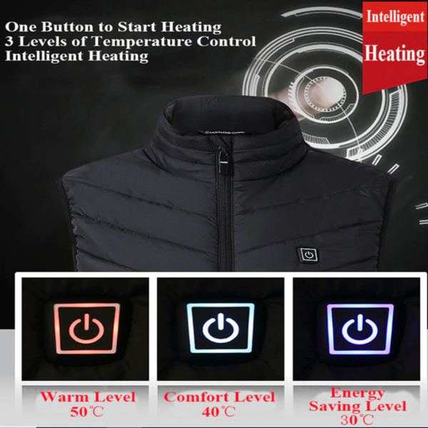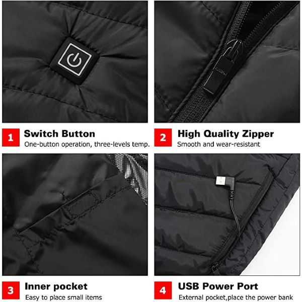 Usar nuestro chaleco es simple y seguro. No utiliza rayos IR, UV ni otros potencialmente dañinos, sino que cuenta con un forro especial que evita la pérdida de calor, previniendo el sobrecalentamiento. Si la temperatura es demasiado alta, reducirá automáticamente el calor para garantizar tu seguridad. Además, nuestro chaleco tiene un control por botón muy fácil en el pecho, que te permite ajustar la temperatura en tres niveles (30°C/40°C/50°C) según cambie el clima.