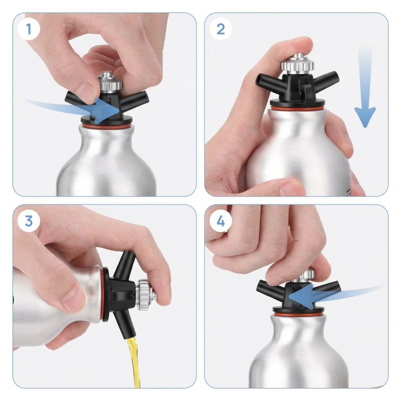 Transfiere el contenido fácilmente sin quitar la tapa ni correr el riesgo de salpicaduras. El inteligente sistema de doble boquilla mantiene el flujo estable y seguro.