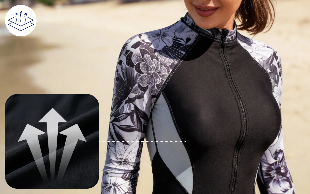 El material se seca rápido después de cada sesión de natación o buceo. Puedes volver a relajarte o jugar sin sentirte frío o cargado.
