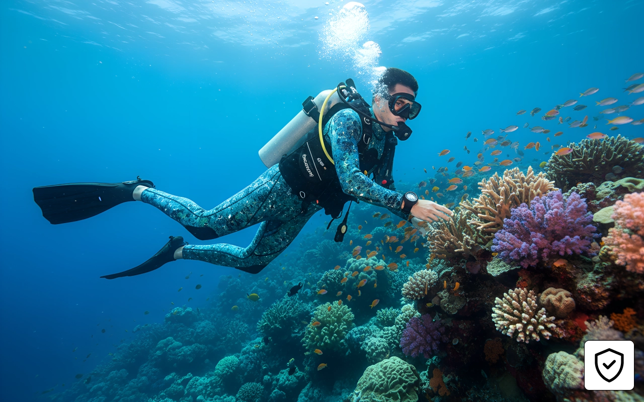 Primera vez usando este traje de neopreno y ya me enganché. Salté de unas rocas y me raspé con coral, el traje no se rompió para nada.