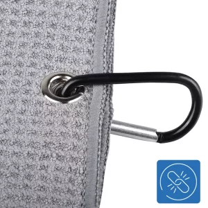 El mosquetón resistente mantiene la toalla Threo firmemente en tu bolsa. No tendrás que preocuparte por perderla mientras juegas.