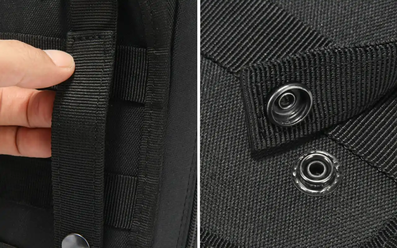 Los broches de cobre y los paneles de liberación rápida aseguran el estuche fácilmente. Colócalo o quítalo rápidamente de mochilas o cinturones para cualquier actividad.