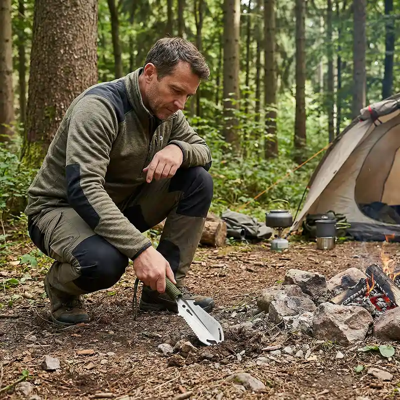 La guardamos en nuestra furgoneta camper y fue muy útil para nivelar el suelo, recortar ramas alrededor del lugar e incluso remover las brasas al asar la cena.