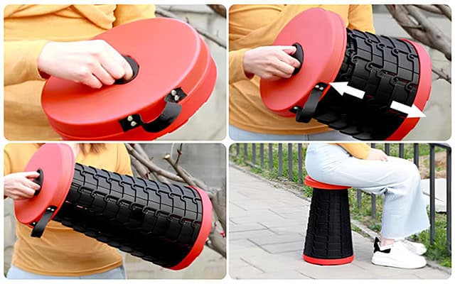 Montar nuestro taburete es muy sencillo gracias al mecanismo telescópico suave. Solo toma las perillas en ambos extremos, sepáralas, gíralas en direcciones opuestas y coloca el taburete en una superficie nivelada adecuada. En solo cuatro pasos simples, tendrás tu asiento listo.