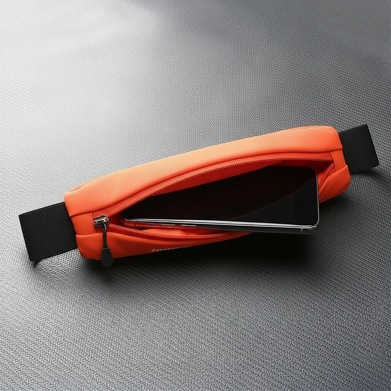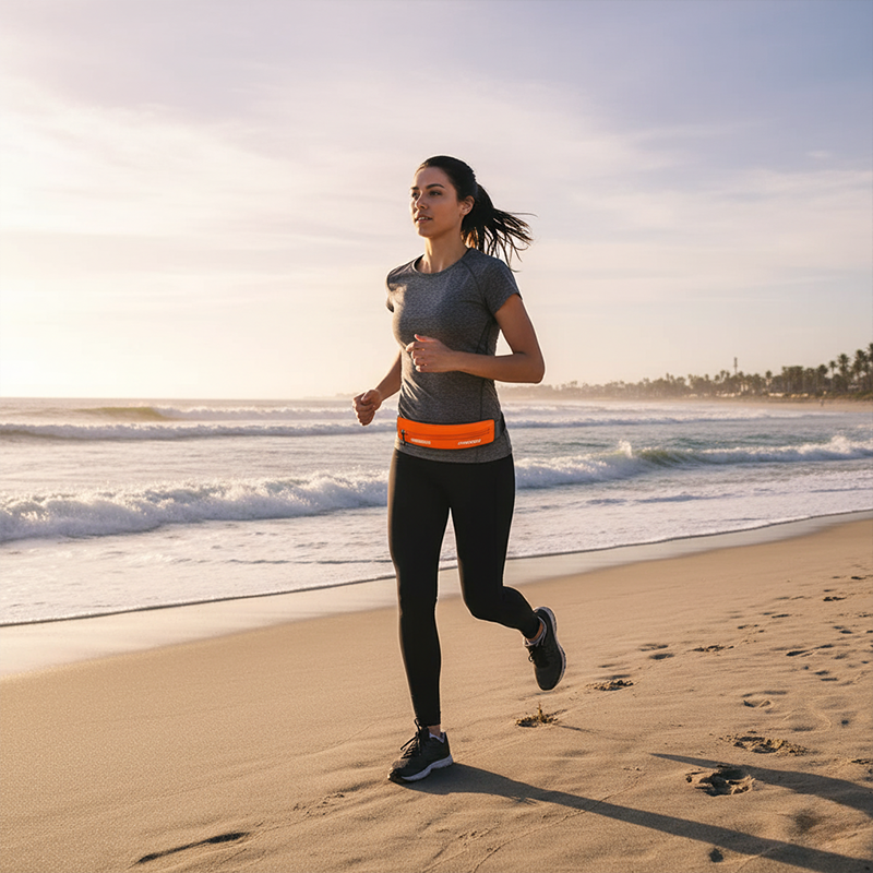 La bolsa de cintura está hecha de neopreno y se ajusta perfectamente plana contra ti mientras corres. Es compacta pero espaciosa: cabe tu teléfono, una llave, un desinfectante de manos y varios objetos pequeños.