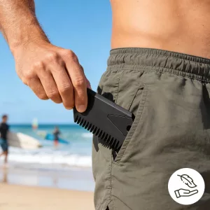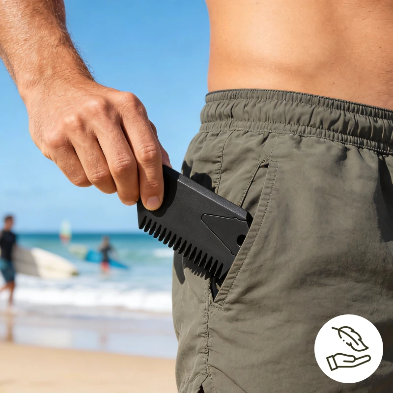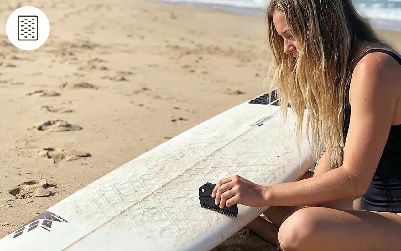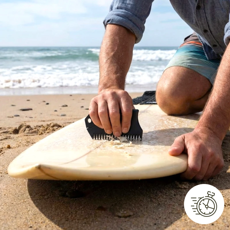 En cada surf, llevo este raspador conmigo. Es genial para quitar la cera rápido antes de entrar al agua. ¡Definitivamente acelera todo!