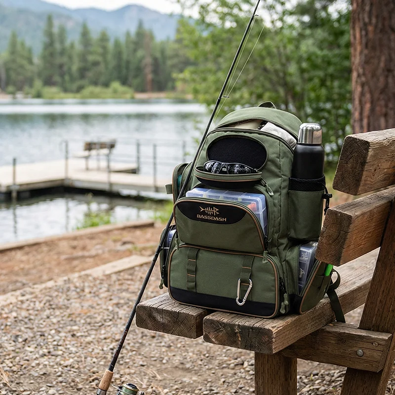 Mochila sólida para la pesca en kayak. Cabe bien debajo de mi asiento y nada se cae. ¡Resiste el barro y el agua perfectamente!