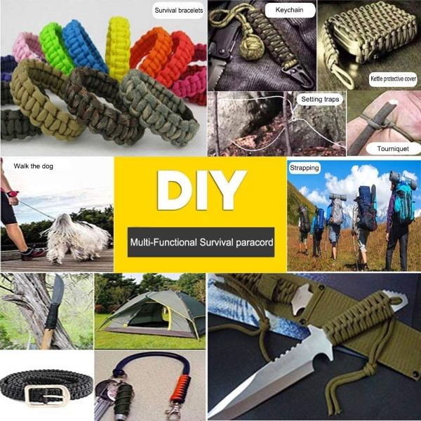 ✔️ MULTIFUNCIONAL — La paracord tiene muchos usos tácticos y militares prácticos y, además de asegurar tiendas, se usa para situaciones de supervivencia, camping, senderismo, pesca e incluso para hacer pulseras y accesorios.