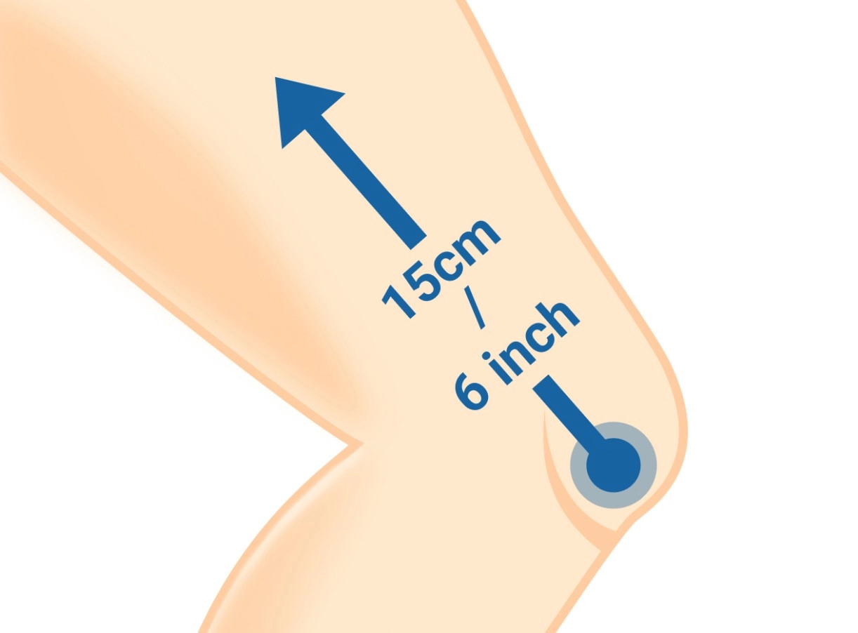 - 2. Envuelve la cinta métrica alrededor de la parte más ancha de tu muslo, aproximadamente a 15 cm/6" por encima del centro de la rótula.