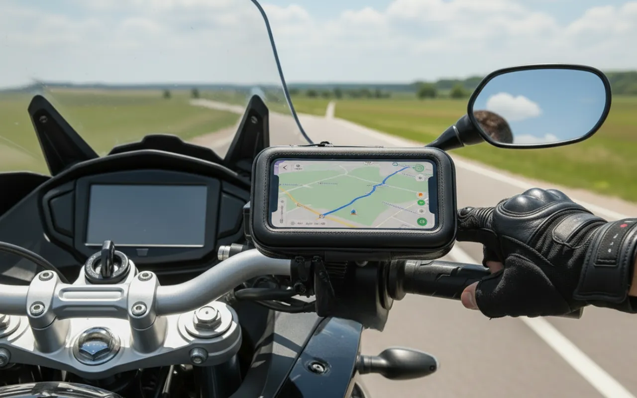 Carreteras inundadas y lluvia torrencial no detuvieron mi GPS con este soporte para teléfono. ¡Me encanta poder cambiar de canción durante el trayecto aun con los guantes mojados!