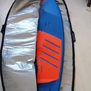 Nuestra bolsa está fabricada con materiales duraderos, incluyendo poliéster plateado, espuma y lona. Factores ambientales como el agua, el sol y la arena no dañarán su tabla. Si la deja caer accidentalmente, el acolchado denso absorberá el impacto.