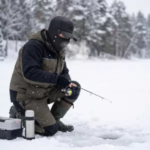 Uso el gorro mientras pesco en el hielo. Las solapas peludas bloquean la brisa del lago y la mascarilla evita que me arda la cara. Encaja cómodamente sobre mis orejas.